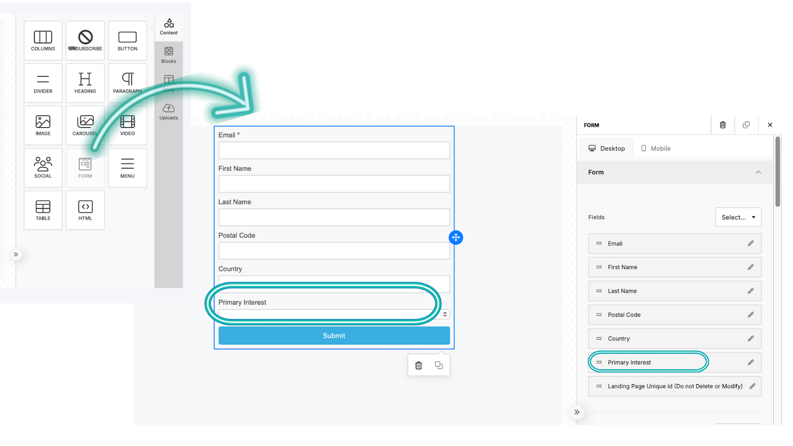 Growth > Create or Update Landing Page > Select & Drag Form to the canvas > click Primary Interest button on the right to edit.