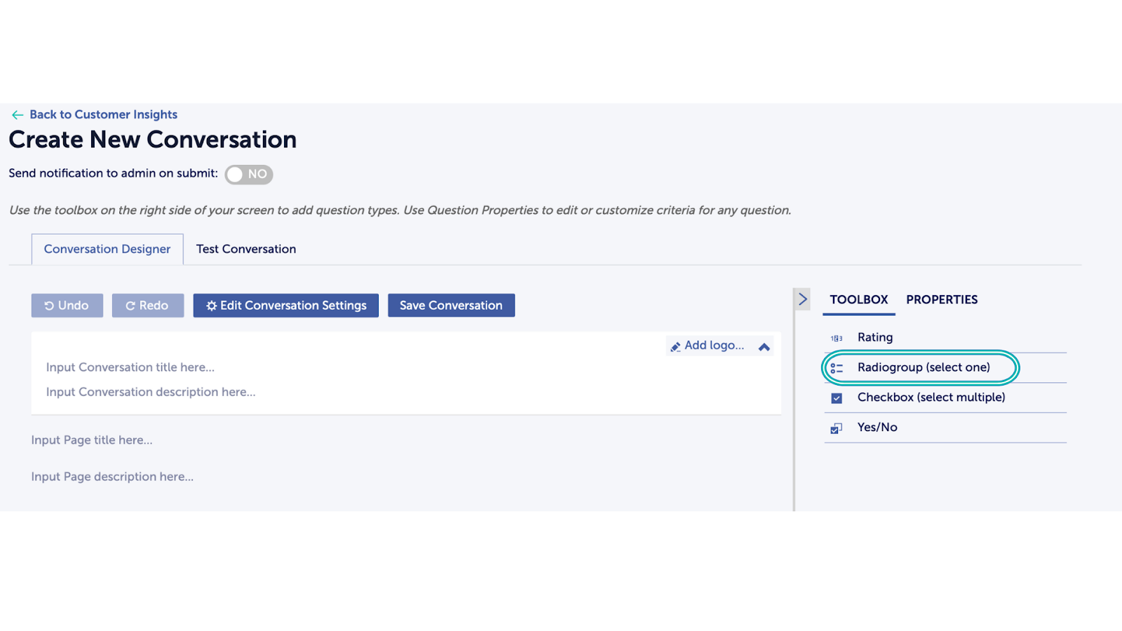 Insights > Create New Conversation > drag Radiogroup question type from the Toolbox to the canvas.