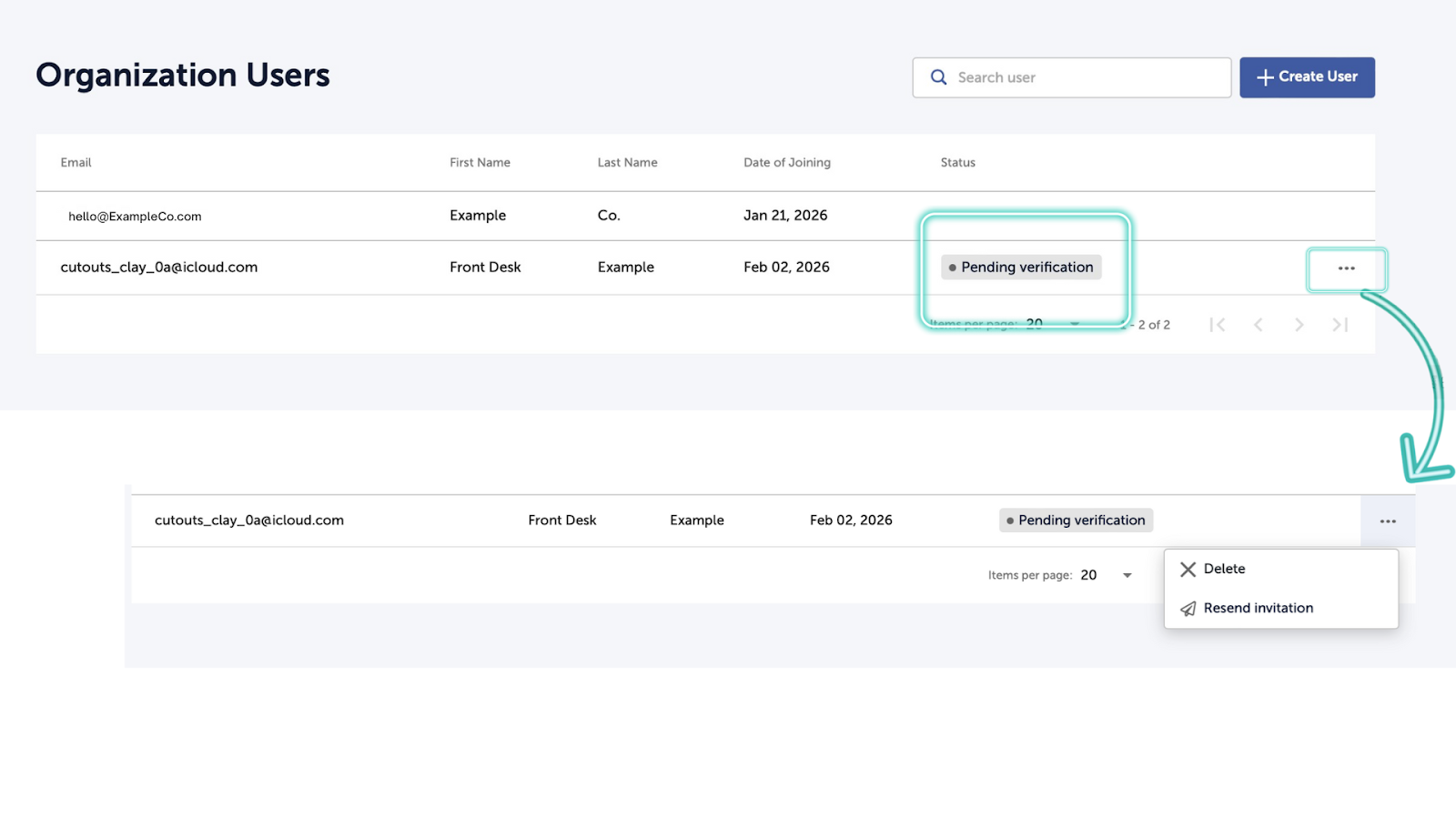 - Pending Verification: shown for users who have not completed account setup. You can resend the verification email by clicking the overflow menu (3 dots) to the right of the desired user.