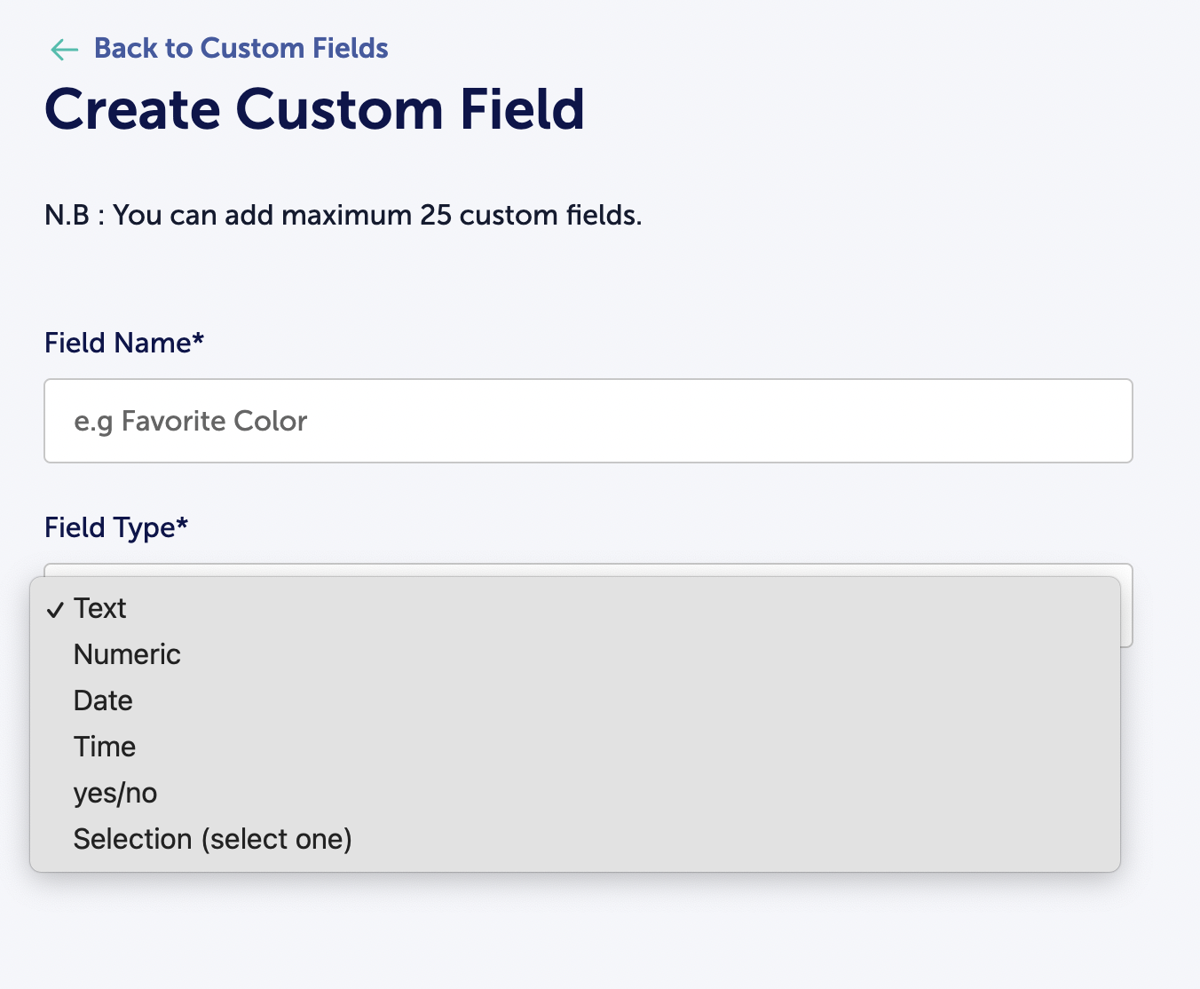 Note, at this time, you can add a maximum of 25 custom fields. Primary Interest does not count toward your custom field limit.