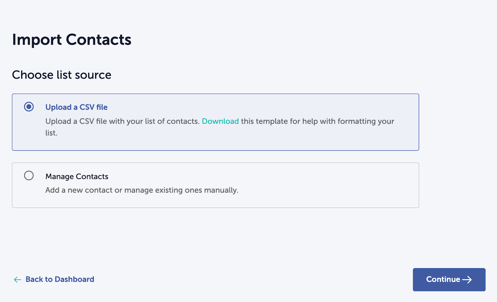 - Upload a CSV file is used for importing large lists of contacts. The Upload File screen includes a downloadable template to help format your file correctly. If you are preparing a CSV for the first time, we recommend using this template.