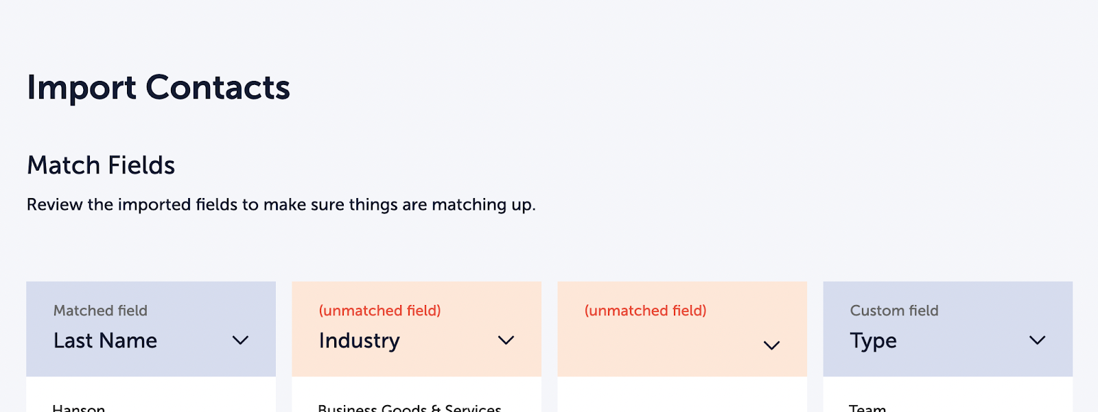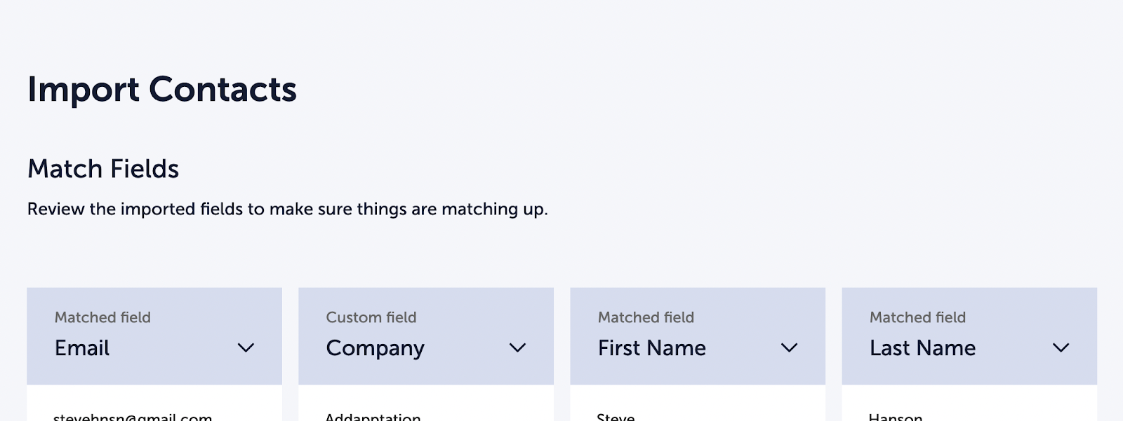 Blue header means the field was matched automatically because the column name in your CSV matches an existing field name in the Database.