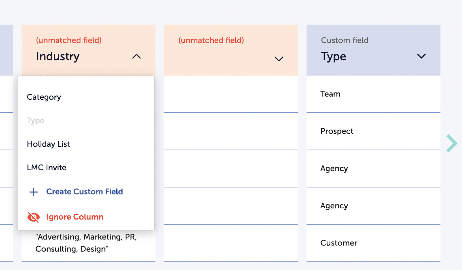 To resolve an unmatched field, click the arrow next to the field name. From the dropdown, you can select an existing field from the list, create a new custom field, or select "Ignore Column" to skip the column entirely. Ignoring a column is useful if your CSV contains data you do not want to import or if you have reached the 25 custom field limit.