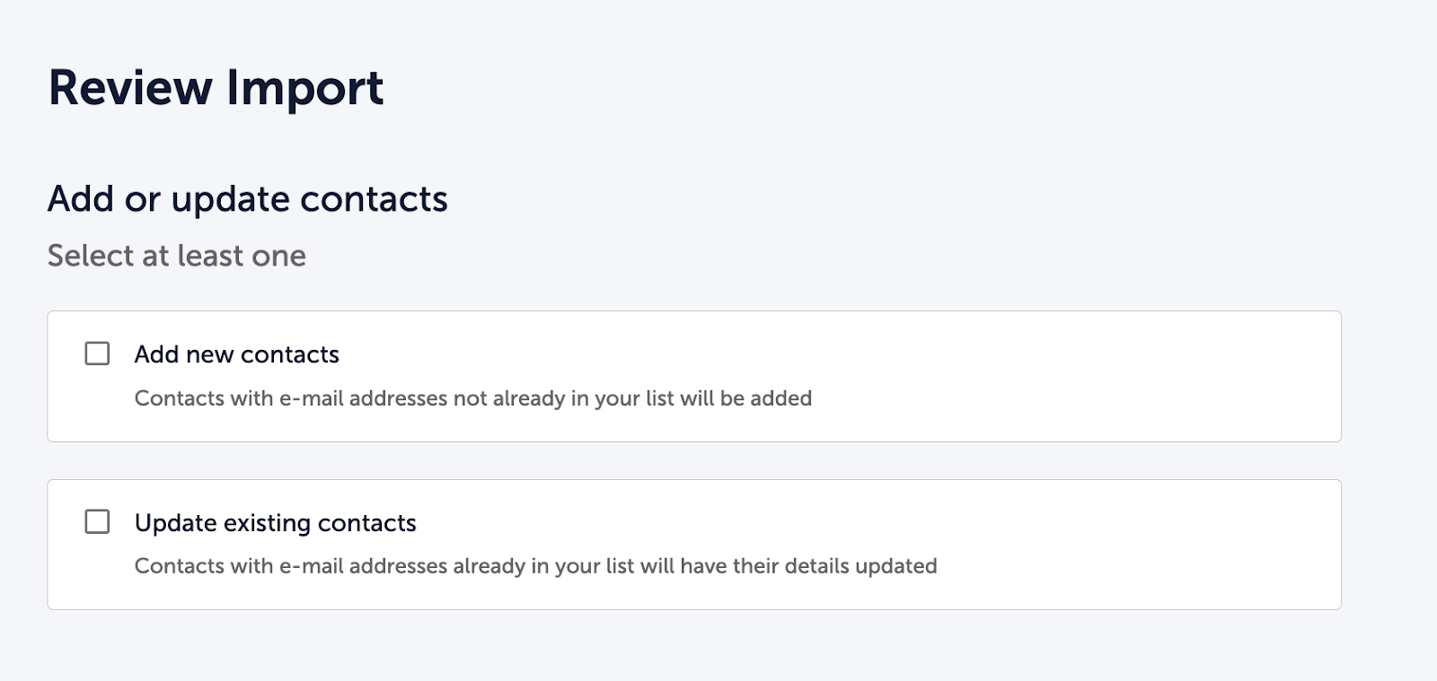 After matching your fields, you will see a Review Import screen with two options under "Add or update contacts." Select at least one: