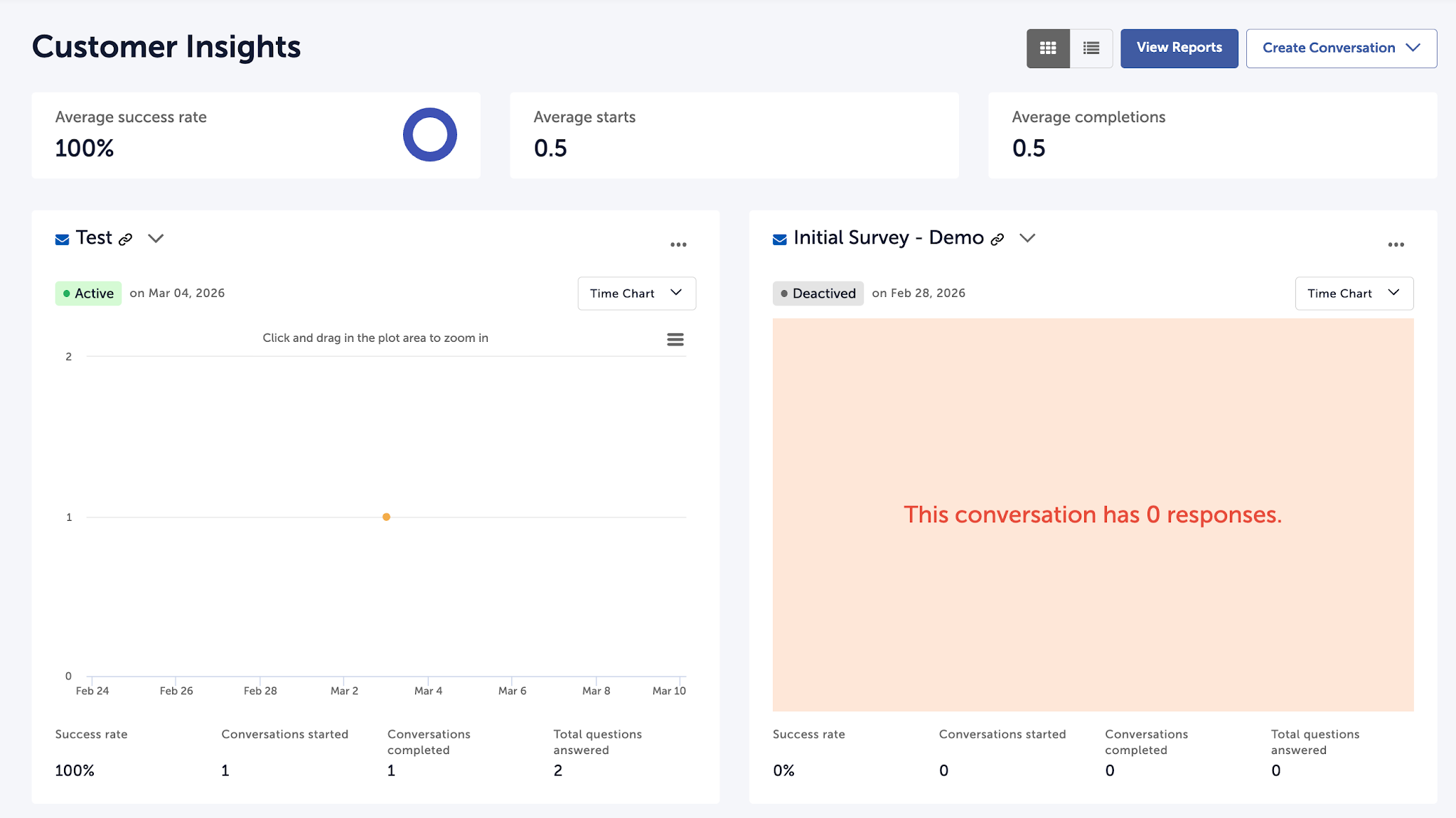 If completion rates drop sharply between consecutive questions, that question may be causing respondents to abandon the conversation. Consider shortening, simplifying, or repositioning that question.