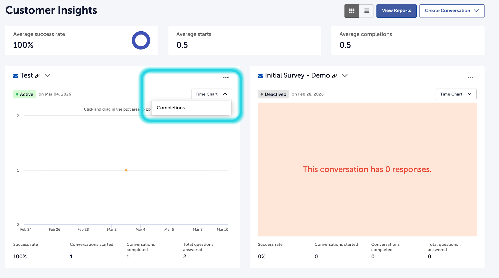 You can toggle between two views for each conversation by clicking the Time Chart / Completions button next to the conversation name.