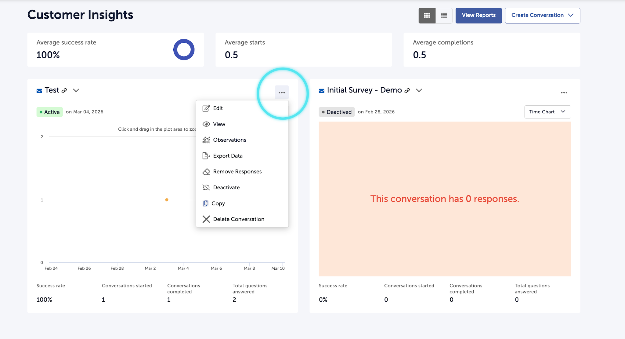 Deactivate stops the conversation from collecting new responses. The conversation remains on your dashboard and all existing data is preserved. If you deactivate a conversation, this option changes to Activate, allowing you to resume collection at any time.