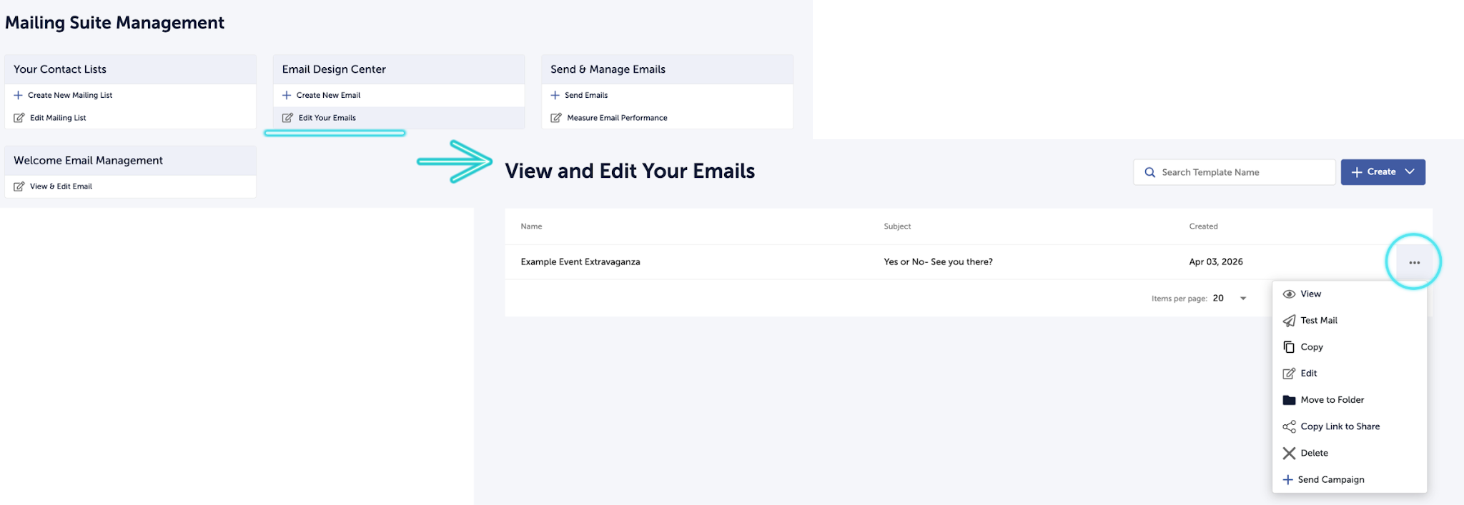 - Create Mailing Template: Opens the Create New Email screen. This is an alternative path to creating a template; the result is the same as clicking Create New Email from the Interaction dashboard. For the full creation walkthrough, see Building and Designing Email Templates.