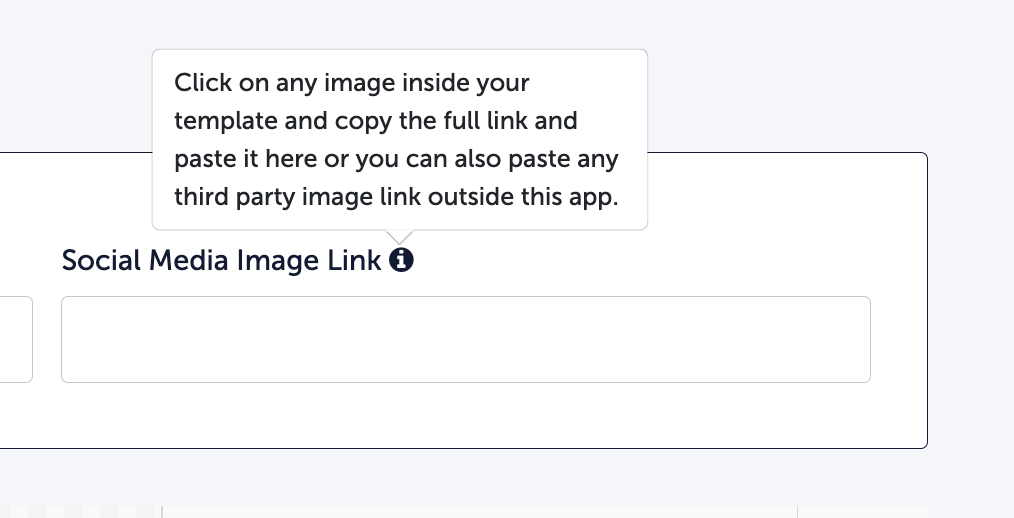 You can use the URL of any image hosted on the public web, including images you have already uploaded into your email template. To use an image from inside your template, click on the image in the editor canvas, then look for the option in the right panel that displays the image's URL. Copy that URL and paste it into the Social Media Image Link field.