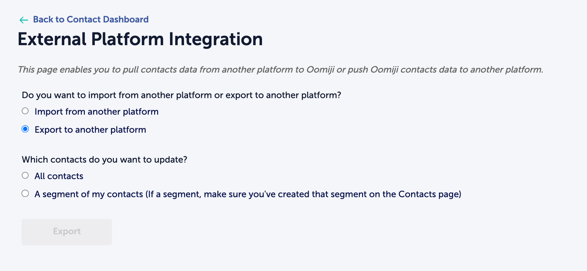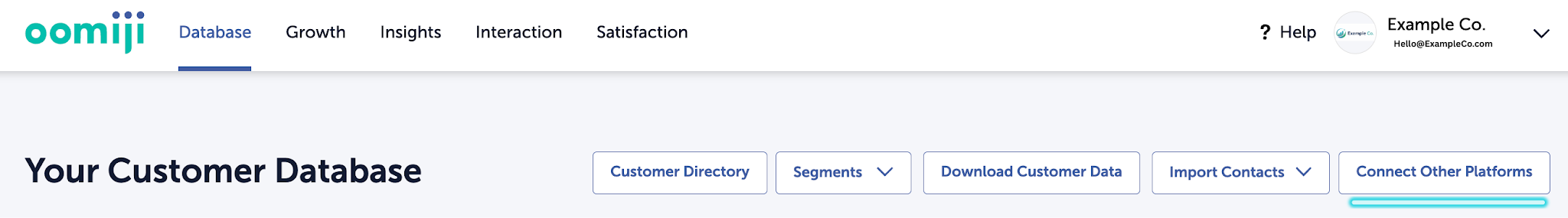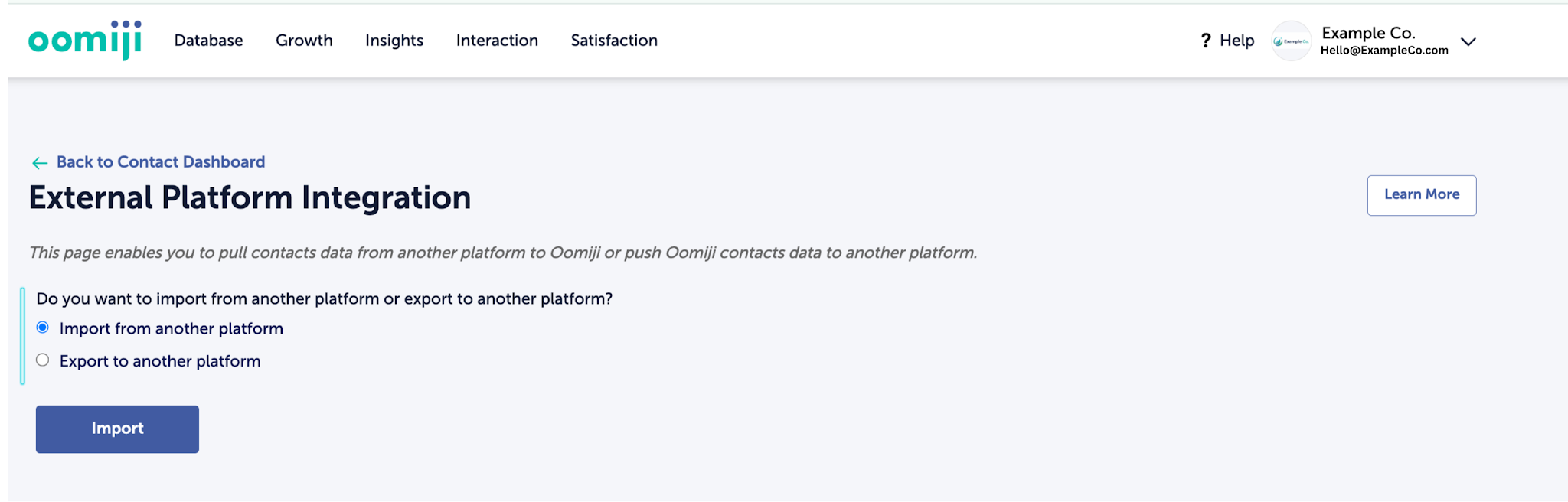 Oomiji connects to external platforms so you can import contact data into the Database or export Oomiji contacts to another system. This feature is useful when migrating from or syncing with a CRM, ecommerce platform, email marketing tool, or other business application.