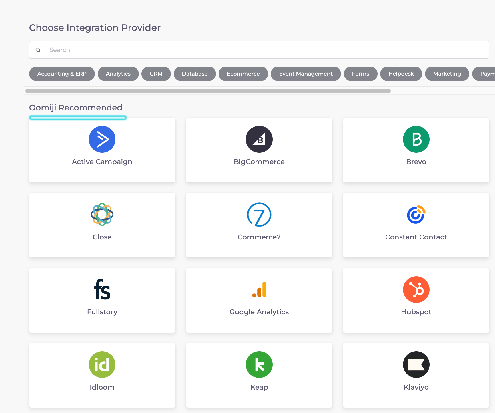 The first group, Oomiji Recommended, contains platforms that have been tested and confirmed by Oomiji. The second group, Providers, contains additional platforms available through MergeLink.