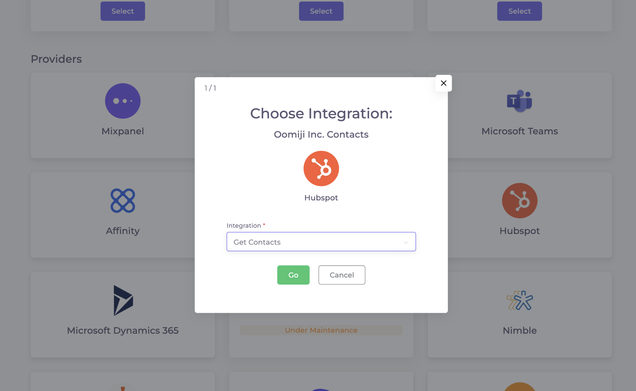 A dialog will appear asking you to choose an integration type (for example, "Get Contacts" for HubSpot). Select the integration type and click Go.
