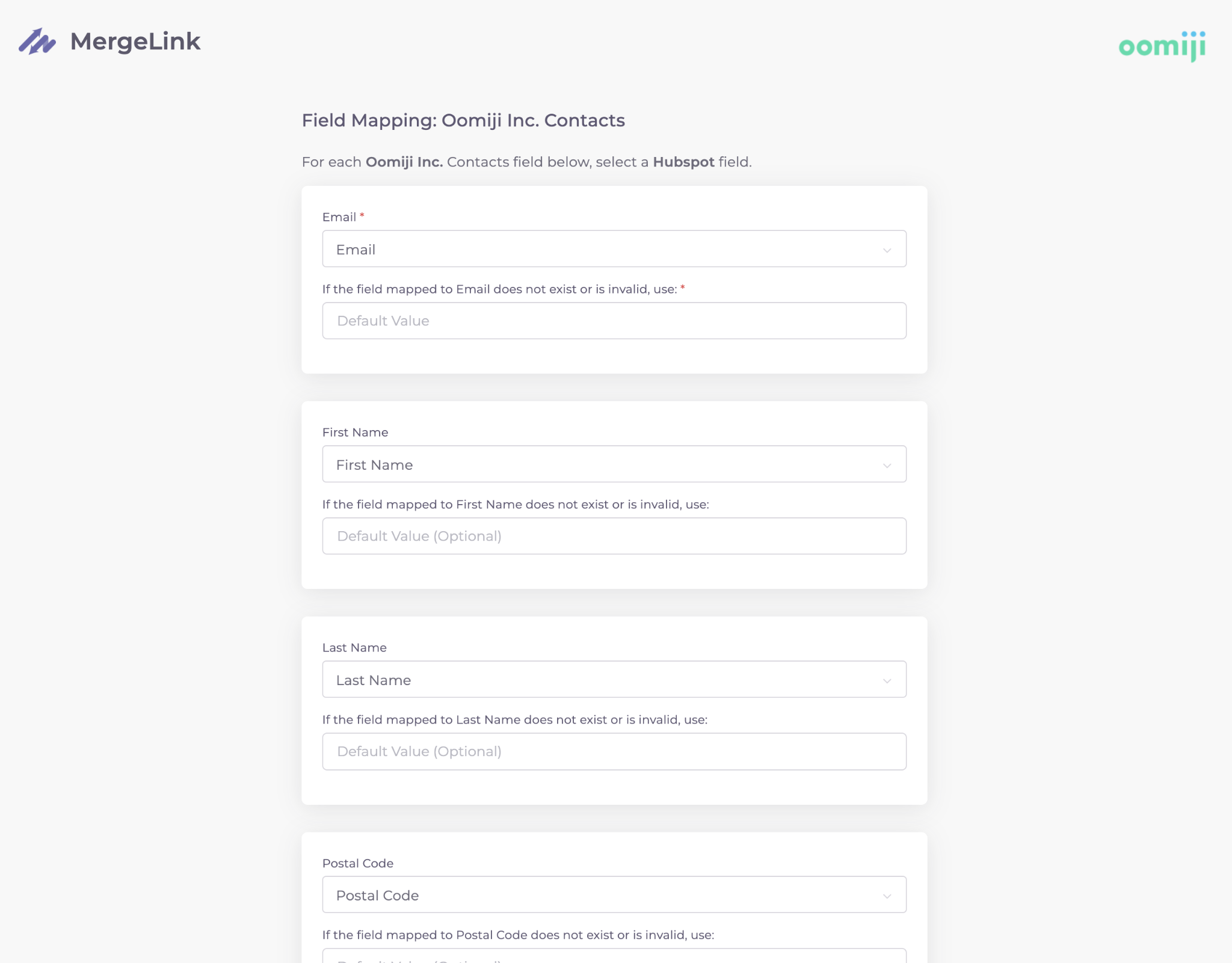 For each Oomiji contact field (such as Email, First Name, Last Name, Postal Code), select the corresponding field from the external platform using the dropdown. The Email field is required. If a field from the external platform does not exist or contains invalid data, you can enter a default value in the Default Value field.