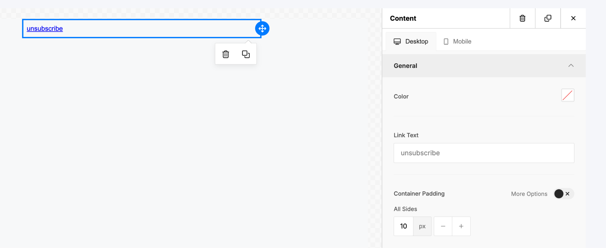 - Drag the Unsubscribe block into your email layout, typically in the footer section.